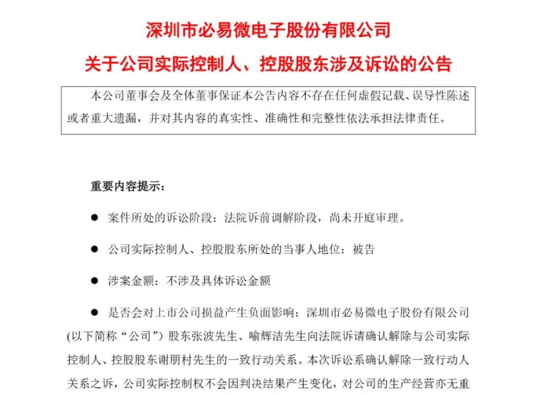 根据公告,近日,必易微接到实际控制人、控股股东谢朋村先生通知,谢朋村先生近日收到深圳市南山区人民法院网络送达的《关于在先行调解阶段开展诉讼前端程序性工作告知书》等文件。